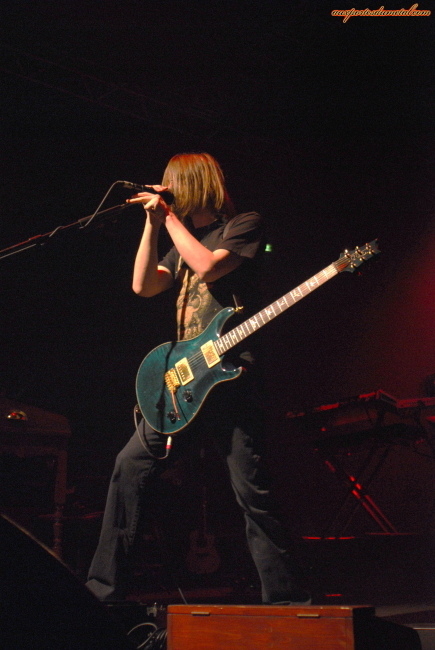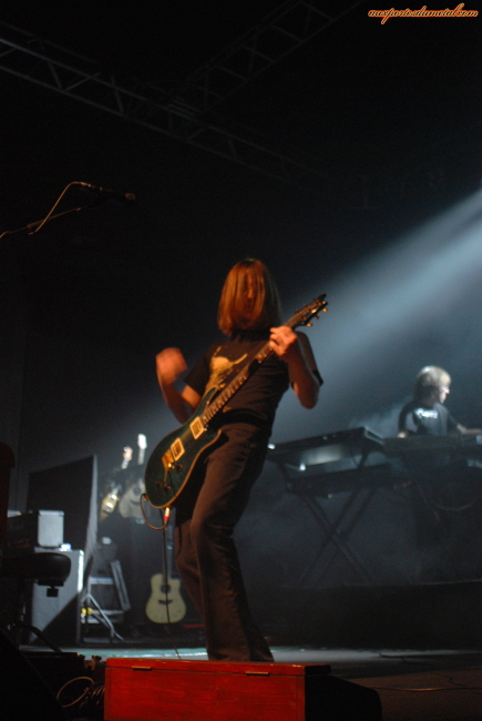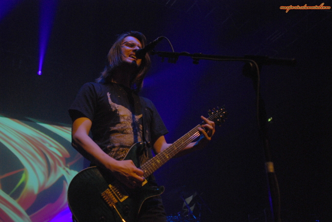 Le groupe débarque enfin, on remarque de suite l’ajout d’un guitariste supplémentaire pour la tournée. C’est encore John Wesley, un guitariste, chanteur, compositeur Américain. Je dis encore, car il a déjà participé aux tournées de In Absentia et Deadwing. Il est aussi connu pour son travail avec Fish, White Lion et son travail en solo (5 albums déjà). Il faut reconnaitre que son apport est important tant au niveau guitare (rythmique quand Steven et en solo et solo sur plusieurs autres morceaux où Steven est à l’acoustique) que au niveau chant puisqu’il fait beaucoup de chœurs derrière Steven. Comme me l’avait expliqué Gavin, ils commencent donc par les 55mn de The Incident. Et comme l’ambiance est sombrissime, la lumière qui va avec est assez faible aussi, du coup les 12mn qui nous sont octroyées dans le pit ne me permettent pas de faire grand chose au niveau photo. Quand on se fait virer, j’ai du mal à trouver un endroit où je vois quelque chose, faut jouer des coudes, la foule est compacte. C’est pas facile d’être petit. Finalement j’arrive à trouver une petite marche. The Incident est joué à merveille. Steven passe rapidement de sa guitare acoustique, à son électrique puis à son piano. Un vrai maestro, bien aidé par son assistant de scène. La video est omniprésente dans le set. Elle étaye la musique. C’est souvent sombre, en noir et blanc, mais tout à fait synchro avec la musique. Le final de la video de la gamine qui se balade sur les rails du train fait presque sursauter sous le choc. Ca rend super bien. Le son est très fort, le contraste entre les moments planants et les riffs heavy est vraiment très impressionnant (rappelez vous les explications de Gavin, ils aiment les contrastes et ça se sent).
