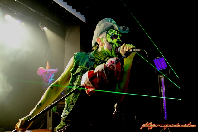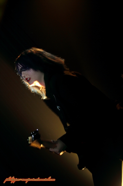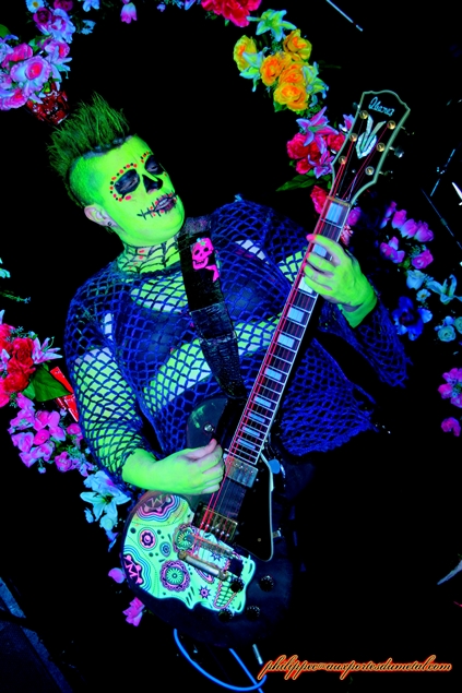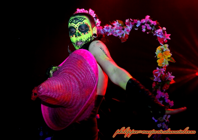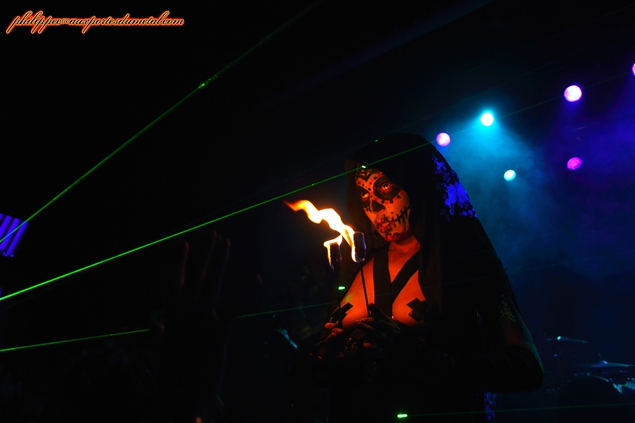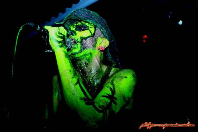 Setlist de Porno Graphic Messiah: 01.Fuck You Darling Pour cette soirée, la MJC Picaud était pleine. Devant la scène, on y retrouvait des fans issus de plusieurs univers (ravers, metalleux, gothiqe, punk...), prouvant qu'avec bientôt vingt ans de carrière, la réputation scénique de Punish Yourself n'est pas usurpée et il faudra peu de temps aux Toulousains pour mettre en trance le public de Picaud. Dès le début du show, le groupe s’approprie la scène, une véritable déferlante sonore s'abat sur nous, ils ne nous donnent aucun répit. A partir de l'introduction Gun, les brûlots s'enchainent : She Buy Me, Suck My T.V, Zmeya, Mothra Lady, Rock n' Roll Machine, CNN War. Le mélange rythmiques surpuissantes et samples martiaux met le public en transe, nous sommes au bord de la suffocation. A ce martèlement incessant se rajoute un visuel apocalyptique : maquillages fluo appuyés par un lightning impressionnant (lasers, stroboscopes...) et surtout les apparitions chorégraphiques de Klodia qui font monter encore plus la température. Ses jeux avec une disqueuse, un sombrero ou avec le feu apportent un côté érotique au show mais sans vulgarité. Le seul répit était peut-être l'instrumental Cult Movie et encore... Sur ce long moment de Metal/électro, Vx69 fit monter une bonne partie du public sur la scène. Pendant qu'il dansait avec un groupie en trance, P-Rlox et Miss Z tout en continuant de jouer, se prêtent aux jeux des photos, se faisant enlacer par des fans qui les shootent avec leurs portables. La foule et le groupe ne firent qu'un, ce moment avait quelque chose d'orgiaque. L'orgie musicale repart de plus belle. Punish Yoursef enchaine les titres : Shiva only is God, Las Vegas 2060's,This Is My Body, This Is My Gazoline...puis Come On Come On, Disposed et Primitive pour conclure le set avec le furieux Gay Boys in Bondage en rappel. Ce soir, j'avoue, n'étant pas un fan inconditionnel du groupe, je me suis déplacé à Picaud par curiosité. Bien m'en a pris car les musiciens de Punish Yourself m'ont filé une grosse claque dans la gueule. Leur prestation fut du haut de gamme, l'ensemble du public présent ne le niera pas, nous sommes tous sortis de la salle épuisés mais ravis du show proposé. J'ai hâte de les revoir au Hellfest.
