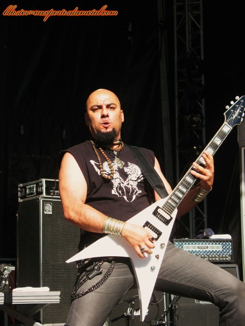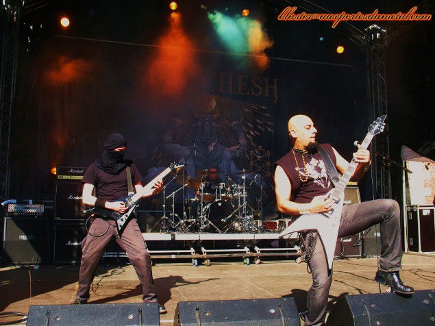 * Grande Scène : Melechesh (Fifi). Melechesh est un combo qui a un gros capital sympathie pour votre serviteur. J'apprécie son Metal Extrême puissant, teinté de sonorités orientales du plus bel effet. La claque prise avec son dernier opus, The Epigenesis, me conforta dans le plaisir de découvrir ce groupe à Raismes. Verdict ? Melechesh délivre une prestation solide (je n'en suis franchement pas surpris), avec un Ashmedi impeccable en chef d'orchestre de la formation. C'est puissant, agressif, les titres s'enchaînent sans temps morts, nous laissant finalement sur les rotules après avoir asséné cette petite claque ! Juste une petite réflexion : je pense que la musique de Melechesh doit avoir un impact plus important en salle (donc dans le noir) ou en plein air, le soir tombé. Bon, ceci dit, le soleil ne m'a pas empêché d'apprécier sans réserve le spectacle ! Setlist Melechesh :