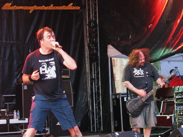 * Grande Scène : Napalm Death (Fifi). Même si j'apprécie Napalm Death... mais plutôt à dose moyenne... je dois reconnaître que le fait de savoir qu'il y en avait pour 1h15 de Death/Grindcore atomique, ça m'a paru un peu beaucoup ! Bon, sincèrement, après le concert, je suis obligé de revoir ma copie. Non, ce n'était pas tant que ça finalement, ça a même passé vite ! Barney a une présence phénoménale, il est à fond les manettes, intenable, toujours en mouvement, sa tête bouge perpétuellement... ce qui ne l'empêche pas d'être très sympa et communicatif avec le public... la classe quoi ! La section instrumentale n'est pas en reste... à fond les manettes je vous dis, le groupe dans son intégralité est dans une forme olympique, salué par les incontournables pogos qui se forment ! Setlist Napalm Death :