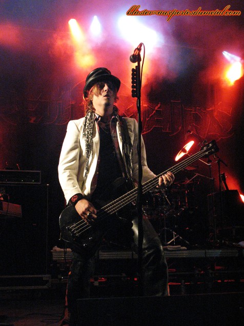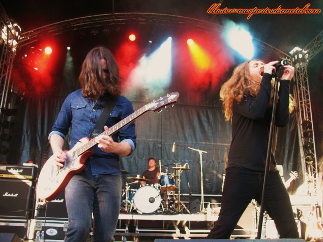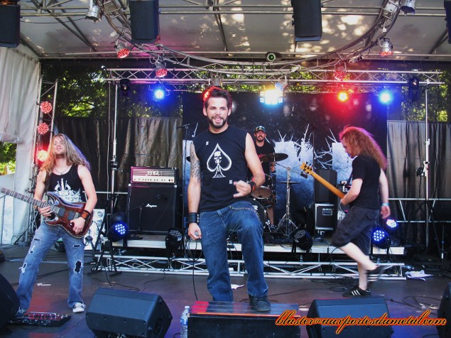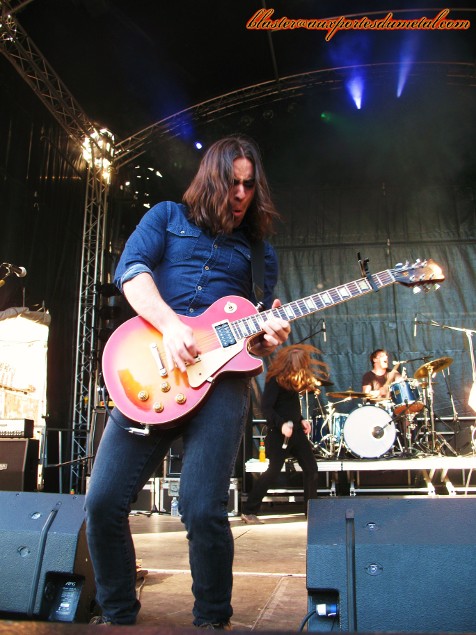 * Grande Scène : 77 (Fifi). Je n'avais jamais écouté un seul titre des Espagnols de 77 et à la fin de la première composition du concert, l'évidence était déjà là : le groupe pratique un Hard Rock totalement inspiré par AC/DC époque Bon Scott. Les attitudes des musiciens, la voix du chanteur (intégralement « Scottienne ») la musique en elle-même... tout est AC/DC... à l'instar des Australiens d'Airbourne ! Mais ce qui fait qu'on ne tourne pas les talons en se disant que plutôt d'écouter un clone, autant écouter l'original, c'est cette monumentale énergie (comme Airbourne) déployée sur scène, qui rend le groupe attachant et fait qu'on apprécie finalement cette formation qui assure franchement, et ce à tous les niveaux !