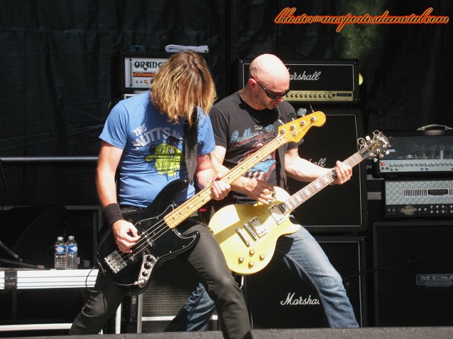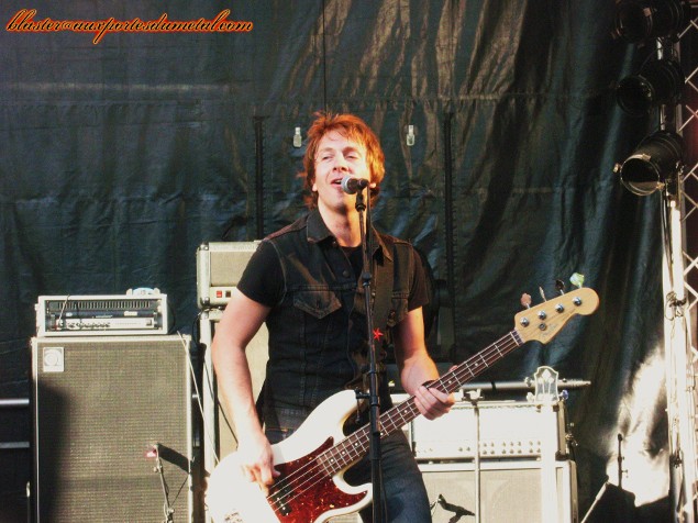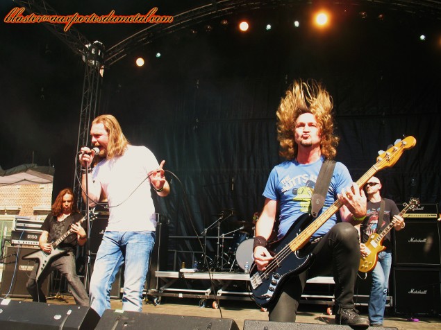 * Grande Scène : Voodoo Six (Blaster). Puis c’est au tour de Voodoo Six d’investir la scène principale. Ce groupe de Hard Rock repéré par un certain Steve Harris, et dont l’album Fluke? avait attiré notre attention est servi par un gros son, très puissant, mais trop fort. Le dernier album est évidemment à l’honneur. Il ouvre le set avec Like The Others Did et le ferme avec Long Way From Home. Entre-temps, on aura eu le droit à Falling Knives, Take Aim, Take The Blame et même une nouvelle chanson nommée Sink or Swim. La prestation est énergique. Les musiciens occupent bien l’espace, mention spéciale au guitariste Chris Jones et au bassiste Tony Newton qui se démènent avec panache. L’autre guitariste, Matt Pearce, est plus cool, bouge un peu moins, caché derrière ses lunettes de soleil… absolument pas superflues puisque les Voodoo Six ont le soleil pile en face d’eux pendant les quarante minutes de leur show. C’est autre chose que les feux des projecteurs, c’est sûr… Le chanteur Luke Purdie est bon et sa prestation ne déçoit pas même s’il ne s’agit pas du frontman le plus énergique de la création. Un minimum de communication est assuré (en même temps, le set est court, il faut privilégier la musique) et Luke tente même le traditionnel partage de la foule en deux camps pour savoir qui crie le plus fort. Oui, ça marche toujours mais cela aurait été encore plus probant avec un public plus nombreux. Espérons que les Voodoo Six auront prochainement l’occasion de montrer de quoi ils sont capables face à une foule plus consistante, ils le méritent amplement. Vivement le prochain album (qui devrait sortir d’ici quelques mois). Setlist Voodoo Six : 01. Like The Others Did
