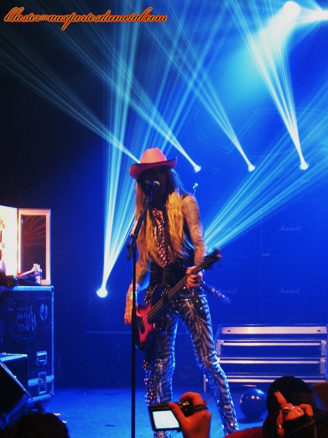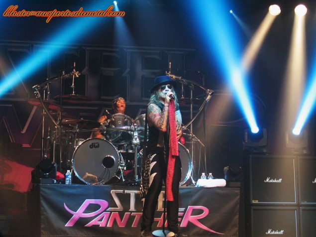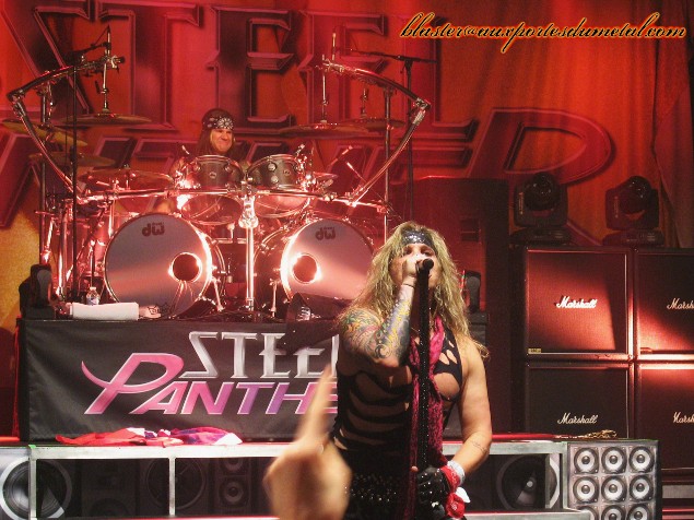 Pendant l'entracte, l'ambiance est électrique. La programmation musicale est absolument excellente (Judas Priest, Ozzy Osbourne, Iron Maiden... des bons vieux classiques qui font chanter une partie de la salle) et alors que le groupe n'est pas encore sur scène, certaines jeunes filles peu pudiques montrent déjà leur poitrine sous les acclamations d'un public en délire ! Et dire que le concert n'a même pas encore commencé... Mais ce que je viens de vous décrire n'est en fait que peu de choses comparé à ce qui va suivre dès que les musiciens de Steel Panther fouleront enfin les planches du Bataclan. Après l'intro (In The Future) c'est logiquement Supersonic Sex Machine qui déboule... et là, la fosse entre en ébullition ! C'est d'ailleurs assez amusant parce que j'ai récemment assisté à des concerts où la musique était plus énergique ou agressive (Arch Enemy, par exemple) que celle présentée ce soir, et pourtant je peux affirmer que je ne suis pas fait "maltraité" avec autant d'intensité dans une fosse depuis très longtemps. Les fans de Steel Panther ont une pêche incroyable (le public est assez jeune aussi), ça bouge, ça saute, slamme, pogotte, pousse, tombe... dans tous les sens ! A tel point que je me demande si je ne vais pas prendre un peu de recul et essayer de sauver mon appareil photo d'une destruction certaine. Mais non... je ne suis pas si vieux que ça, merde... allez, je reste ! Si l'on doit comparer le show de ce soir avec celui d'il y a sept mois, on peut déjà noter que l'ambiance est encore plus explosive. Il y a également plus de monde que dans mon souvenir (mais bon, cela vaut ce que ça vaut, je n'ai pas les chiffres). D'autres changements ? Le light show est plus fourni. Visuellement, ça en jette davantage. A part ça, les panthères d'acier sont toujours maquillées, perruquées et... graveleuses. C'est donc reparti pour un placement abusif de "couilles", "vagins", "nichons", "chattes", "bites" et consorts à tous les étages. Bien sûr, c'est ça Steel Panther, pourquoi s'attendre à autre chose ? Et si l'on accepte de jouer le jeu et de s'adonner à cette régression avec second (ou dixième) degré, c'est même fun... sauf que maintenant que l'effet de surprise est un peu passé, je dois avouer que je commence à percevoir les limites d'un tel exercice de style. J'y reviendrai. Les titres s'enchaînent et le début du show est, setlistiquement parlant, assez proche de celui de mars dernier et quand au bout de cinq ou six chansons je me demande si les Américains ont décidé de nous refaire rigoureusement le même concert (en changeant juste quelques chansons de place), l'arrivée de Let Me Cum In (absente du concert précédent) vient me rassurer. Ouf ! If You Really Really Love Me, Girl From Oklahoma ou The Shocker viendront aussi se faire leur place dans la setlist et compléter ainsi la liste des nouveautés. Autre bonne surprise : le moment où Michael Starr interpelle un gars du public qui porte un T-Shirt Iron Maiden et l'invite à monter sur scène alors que le groupe commence à jouer The Number Of The Beast. Le fan s'éclate sur scène et chante (plutôt mal, mais c'est drôle) le premier couplet suivi du refrain, accompagné par le groupe. Fun ! Les qualités de Steel Panther demeurent. C'est bien fait, bien joué, les chansons sont super entraînantes, Michael Starr est un très bon chanteur, Satchel est un guitariste qui n'a pas les mains dans ses poches... Musicalement, c'est solide. Le tout se passe dans une ambiance délirante, les filles se dénudent partiellement avec le sourire, tout le monde joue le jeu et semble passer un bon moment... Satchel et Michael se lançeront même pendant un court instant dans une fausse ballade acoustique nommé "J'aime la chatte" pour l'occasion. C'est du grand n'importe quoi, c'est évidemment très grossier mais il y a quelque chose de libérateur et pas prise de tête qui fait son petit effet. Et puis, tout ça, c'est du show, n'est-ce pas ? C'est fait exprès, c'est de la parodie... Oui, oui... bien sûr que tout ça, c'est pour rire. Mais n'empêche que j'en arrive quand même à ce que je considère comme les petits bémols d'une partition imparfaite. Déjà, c'est très répétitif. Et le groupe parle trop. Certains moments sont véritablement hilarants, je ne crache pas dans la soupe, mais d'autres sont bien trop longs et n'apportent rien. En plus, et c'est là que ça devient gênant, les quatre amis reprennent certaines vannes déjà entendues il y a quelques mois... au mot près. Et on commence à se rendre compte que si une partie du spectacle laisse libre cours à l'impro et au délire ambiant, une autre est vraiment "écrite". Alors oui, j'avoue avoir souri poliment à quelques blagues un peu redondantes tout en commençant à ressentir une certaine lassitude. Le bla bla et la grosse potacherie (aussi forcée et mise en scène soit-elle), ça va cinq minutes... mais j'ai du mal à m'esclaffer au douzième "j'aime la chatte" qui sort de la bouche de Satchel. En parlant de répétition et de Satchel justement, son solo est toujours aussi excellent (debout derrière la batterie, il balance une succession de riffs et thèmes qui ont fait les grandes heures du Hard Rock) mais c'est rigoureusement le même qu'en mars dernier. Dernière petite critique que j'avais déjà formulée la dernière fois : l'utilisation de samples (on entend bien quelques choeurs enregistrés, claviers ou pistes de guitares supplémentaires à l'occasion). Vu la musique pratiquée et le savoir-faire des musiciens, je trouve ça totalement inutile. Bon, ce n'est pas bien grave mais le procédé (pas très rock'n'roll) me semble toujours un peu discutable. Evidemment, la soirée fut chaude. Bien sûr, j'ai passé un très bon moment et tout cela fut bien fun... mais les Steel Panther devront prendre garde à ne pas sombrer avec autant d'empressement dans la répétition et la facilité. On ne les a pas e