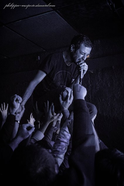 C’est au tour de la tête d’affiche d’entrer sur scène. Le Korigan est bien rempli, la scène aussi puisque le collectif se présente avec six musiciens ce soir. Comme ce fut le cas pour Hacride, le groupe entre dans le noir. The Ocean se met en place sur l'intro Epipelagic enchaînée avec Mesopelagic: Into the Uncanny. La magie opère de suite avec ce titre, à la fois violent et atmosphérique et ça continue avec le prochain Bathyalpelagic I: Impasses, une merveille ! Loïc Rossetti, le chanteur, est époustouflant autant sur les parties claires que hurlées. Bathyalpelagic II: The Wish in Dreams en est une preuve. Si vous connaissez le répertoire du groupe, vous comprendrez vite à l'annonce des morceaux joués, que ce soir nous avons eu droit à la totalité de Pelagial, leur nouvel opus. Aux premières paroles de Loïc, entre les titres, je suis agréablement surpris : il nous parle en français et sans accent. En fait, c'est un gars bien de chez nous qui s'est acoquiné avec ces supers musiciens teutons ! Ce mec est incroyable, on ne peut pas dire que le public devant la scène est vraiment dense mais qu'importe, sans prévenir, il va se jeter plusieurs fois de la scène pour un stage diving. Ce qui est incroyable, c'est qu'à chaque fois, la foule va le porter en triomphe à bout de bras comme un héros et pendant plusieurs minutes, lui laissant le temps de chanter quelques couplets, balloté sur une vague... comme en plein océan !