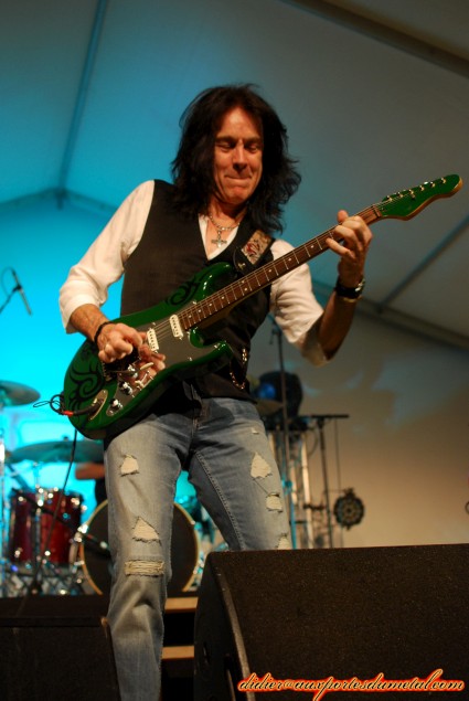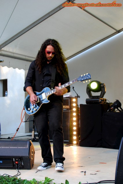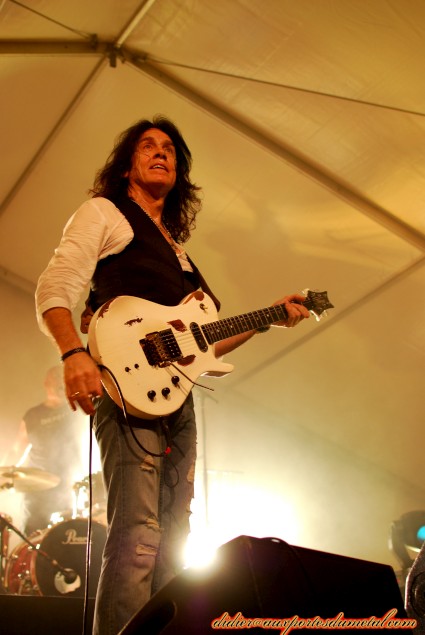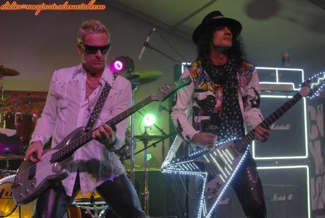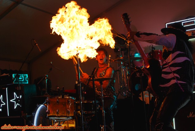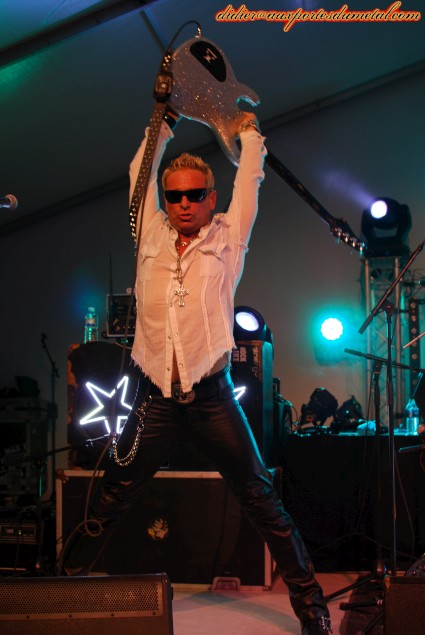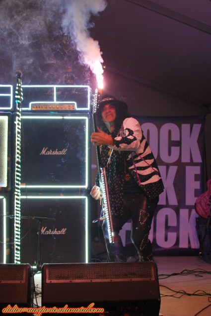 Effectivement Adam Bomb a l'air pas content. Pendant la mise en place de son matos (visiblement il n'est pas du genre à partager un backline), il envoie bouler tout le monde. Quand tout est prêt, il demande l'heure à son bassiste et râle qu'il commence avec 30 minutes de retard. On a envie de lui dire que c'est pas grave on est en festival et on a tout notre temps, mais on n'a pas le temps car il envoie la purée. La batterie (différente des autres) est installée sur le devant de la scène. C'est un batteur assez jeune qui assure le show. Quand nous avions vu Adam Bomb à Nice il avait une batteuse-bûcheronne assez impressionnante. C'est aussi un nouveau bassiste, très démonstratif, avec des poses lassives et un look assez punk. Adam Bomb reste Adam Bomb: le king de la lumière et des effets pyrotechniques à deux balles. Adam est aussi un fan de LED (Light Emitting Diode), il en met de partout : ses guitares en sont couvertes, sa sangle, son pied de micro, ses amplis, bref, il ne lésine pas sur les watts de loupiottes. Et comme il faut de l'électricité pour alimenter tout ça, peu certes mais il en faut, il y a des fils et des transfos 12V de partout. Il débranche, rebranche quand il change de guitare, car Adam est son propre guitare tech. Le son est plus cradingue que les autres, mais c'est le son heavy-punk de Adam Bomb, et on va pas changer le bonhomme ce soir. Au début du show, le bassiste lui vole la vedette par ses postures. Il envoie du lourd, basique mais lourd. Mais Adam a plus d'un tour dans son sac et surtout son sac est rempli de fumigènes et de fusées qu'il coince au bout de son manche de guitare avant de les enflammer. Ca n'arrête pas. Adam est vêtu d'une veste simili cuir et vrai plastoc, et ça doit chmouter sec là dedans car dès qu'il baisse son bras gauche, ça dégouline de sueur. Ca c'est du rock !