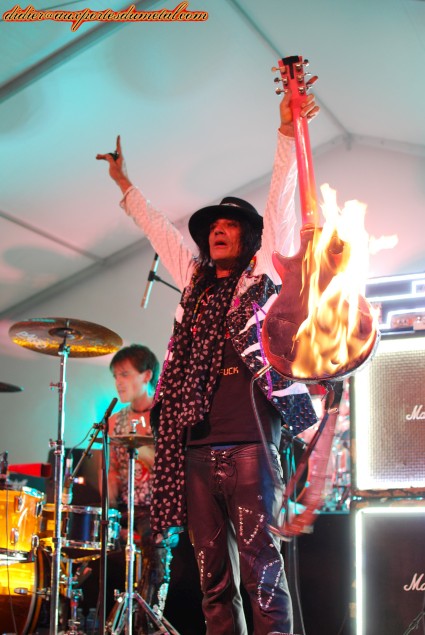 Adam se lance dans un petit moment où il nous raconte sa vie, les artistes qu'il a croisé, et à chaque fois c'est ponctué par des extraits de morceaux mythiques de hard rock (Van Halen, Led Zep, AC/DC), on apprend plein de truc utiles : son père lui file un joint à 14 ans, Eddie Van Halen lui explique comment utiliser un médiator pour sniffer de la coke, etc, etc. Puis il se lance dans un solo de guitare, mais comme c'est encore pas assez fort, il prend son micro chant et le coince contre son ampli de guitare, un gros Marshall, évidemment. Le son monte d'un cran, évidemment aussi, et l'ingénieur son, à la table de mixage doit s'arracher les cheveux, mais c'est ça le rock ! Le rock c'est Adam Bomb. A l'occasion, jetez un œil à sa page web, ce mec est un fou ! En mars 2014 il a fait 28 dates sur 31 jours ! Une bête de scène, un vrai rocker ! Bien sûr Adam a aussi manié le feu. Il commence par enflammer le dos de sa Les Paul rose, arrosée d'alcool, puis il arrose à deux reprises la cymbale de son batteur avant de l'enflammer. Quand le batteur tape sur la cymbale, l'effet est bœuf. A la fin, l'heure de la vengeance a sonné, car au moment où on lui fait signe d'arrêter, il enchaine, Black Dog, Whole Lotta Rosie et Rock 'n' Roll. Il jubile ! Fallait pas faire chier Adam Bomb !