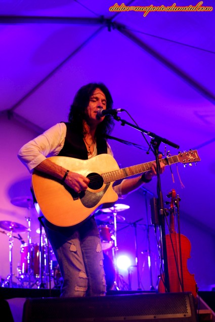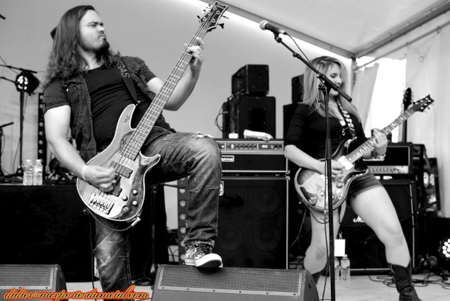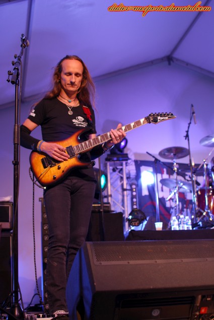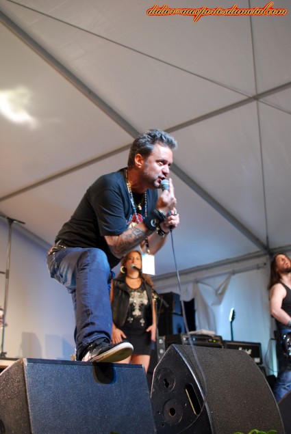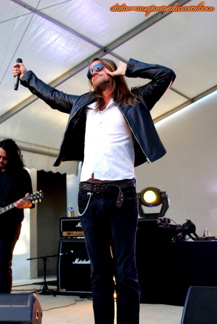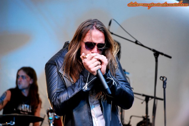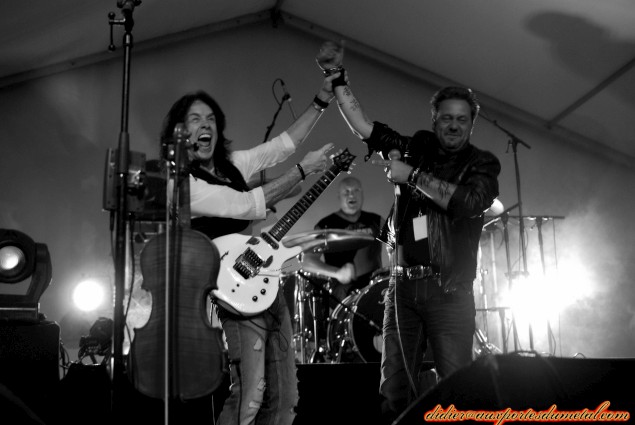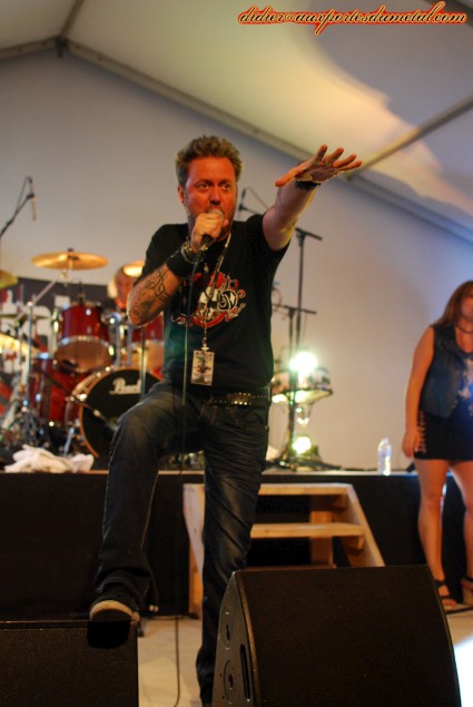 Voodoo Vegas s'installe sur scène. Ils utilisent un backline commun donc il y a peu d'attente entre les groupes, c'est bien agréable. Le groupe est composé d'un chanteur qui ressemble un peu à Sebastian Bach, d'un bassiste, un batteur, un guitariste et une guitariste. C'est elle qui assure une bonne partie des solos. Le niveau monte d'un cran, dans le professionnalisme et dans la qualité du son. Le groupe est très bien en place. Il fait encore soleil et le chanteur a gardé des lunettes, qui rendent l'échange avec le public plus difficile au début. Il essaye de parler en français mais précise que "mon français, c'est merde". Il est super sympa et très démonstratif. Son niveau de sympathie grimpe en flèche, pour moi, quand il sort de sa poche un harmonica et vient compléter certains morceaux. Ca rajoute une note vintage que l'apprécie. Je suis très agréablement surpris de leur hard rock, entre G&R et Skid Row. Ils gagnent franchement à être connus. Du coup je file chopper un CD à la fin du set, qu'ils me signent. Le CD date de 2012 et leur setlist de ce soir contient du coup pas mal de nouveaux morceaux à paraître.