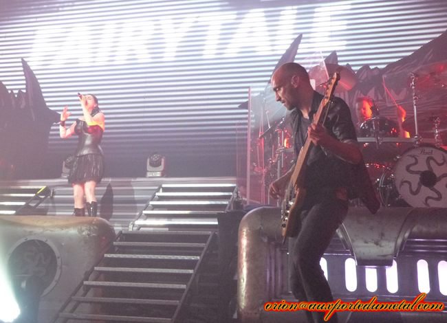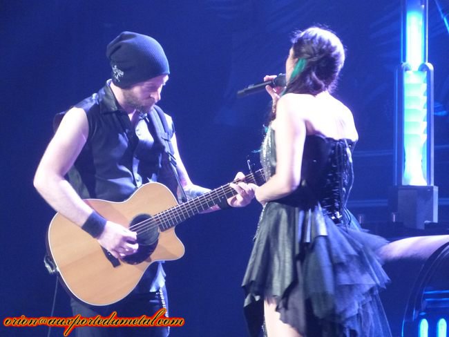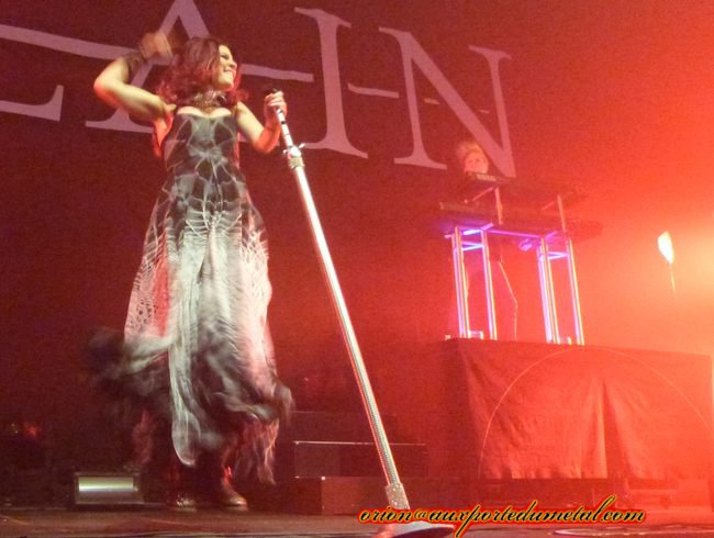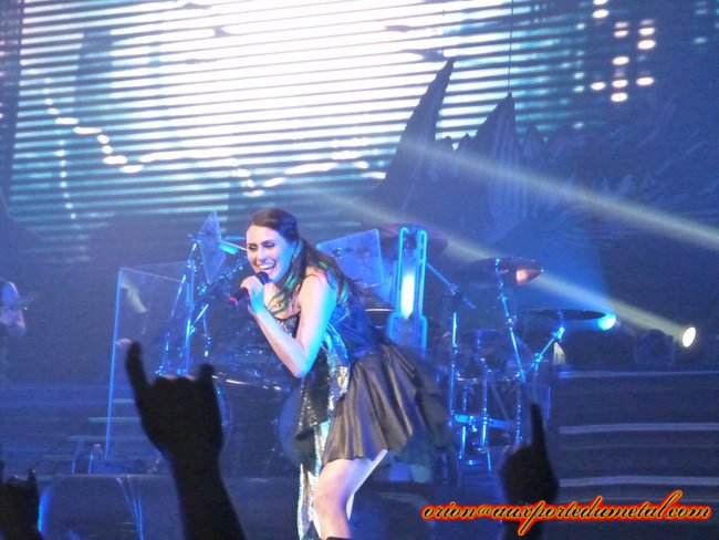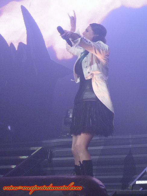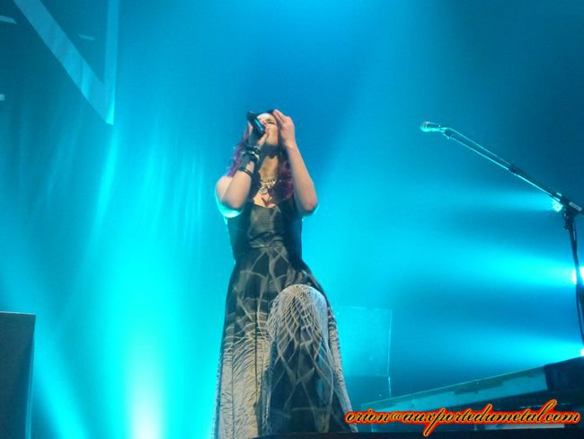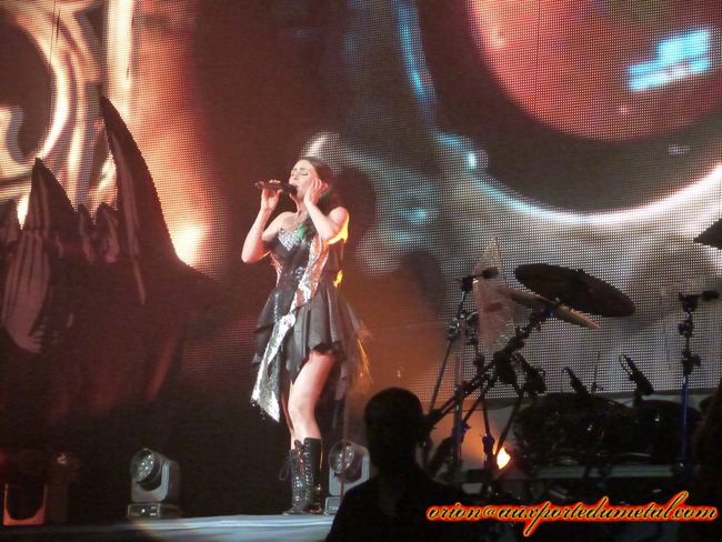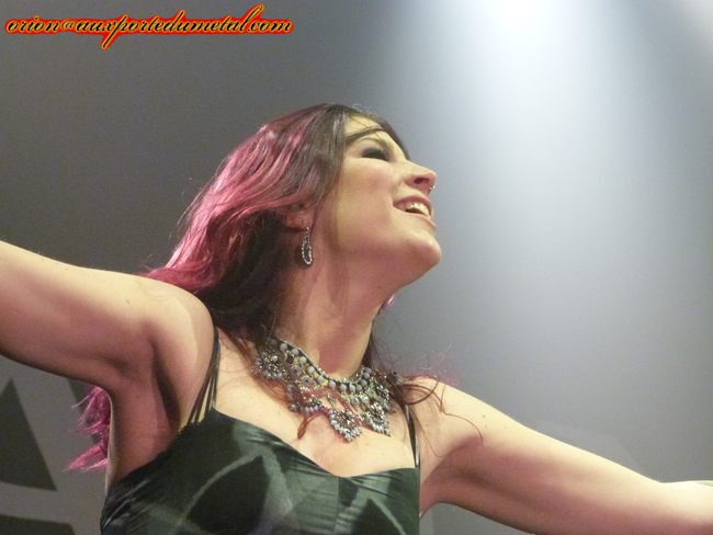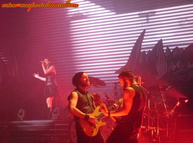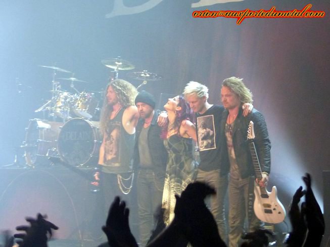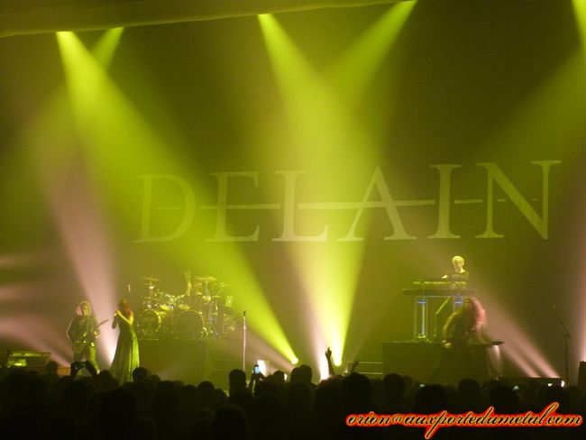 Voilà une affiche on ne peut plus homogène. Within Temptation avec en support Delain, c’est la fête du Metal Symphonique de haute volée. Les deux groupes venant de sortir chacun de leur côté un très bon album, ce soir est l’occasion à ne pas rater pour les fans du genre. Le Zénith de Nantes, qui accueille les deux groupes néerlandais, n’est pas complet mais affiche un bon remplissage quand même. A 18h30 pétantes, c'est parti. Les retardataires vont louper Delain et c'est bien dommage pour eux car les Néerlandais, menés par le ravissante Charlotte Wessels, vont plus que remplir leur rôle. Ils ne disposent pas d'énormément de place sur scène, deux mètres de recul tout au plus. Heureusement que la scène du Zénith est large. Même l'avancée de scène dans le public ne leur est pas autorisée apparemment, puisque aucun des membres de Delain ne s'y risquera. Mais tout cela n'empêche pas le groupe de donner son maximum. Charlotte est une excellente frontwoman, chaleureuse et souriante, et dont la voix n’a pas montré le moindre signe de faiblesse. Le reste du groupe est assez discret, mais il faut bien dire que tous les regards sont tournés vers la jeune femme (ainsi que l’objectif des appareils photo). C’est véritablement elle qui fait le show et qui communique, tentant même quelques mots en français, ce qui fait toujours plaisir au public. Delain aura le temps de nous proposer deux morceaux du dernier album, Army Of Dolls et Stardust (le nouveau single), quatre titres de We Are The Others et un de chacun des deux premiers albums. Et c’est tout. Car, hélas, après à peine trente-cinq minutes de show, c'est terminé. Le groupe salue et Charlotte donne rendez-vous aux fans en fin de concert pour des dédicaces (et elle tiendra parole, se révélant une artiste très accessible et proche de ses fans, répondant favorablement à toutes les sollicitations de photos et autre signatures). On attend un éventuel rappel mais une immense tenture aux couleurs du dernier album de Within Temptation, Hydra, tombe du plafond. Il faut se faire une raison, c'en est bien fini de la prestation de Delain. J'éprouve une certaine frustration.