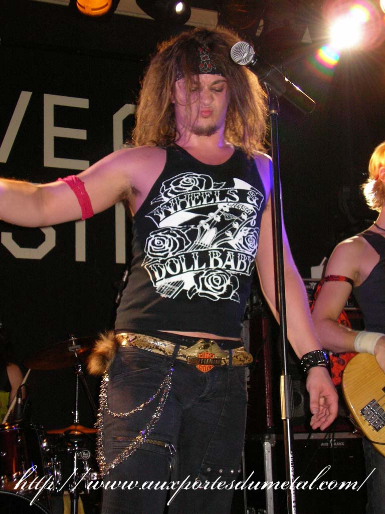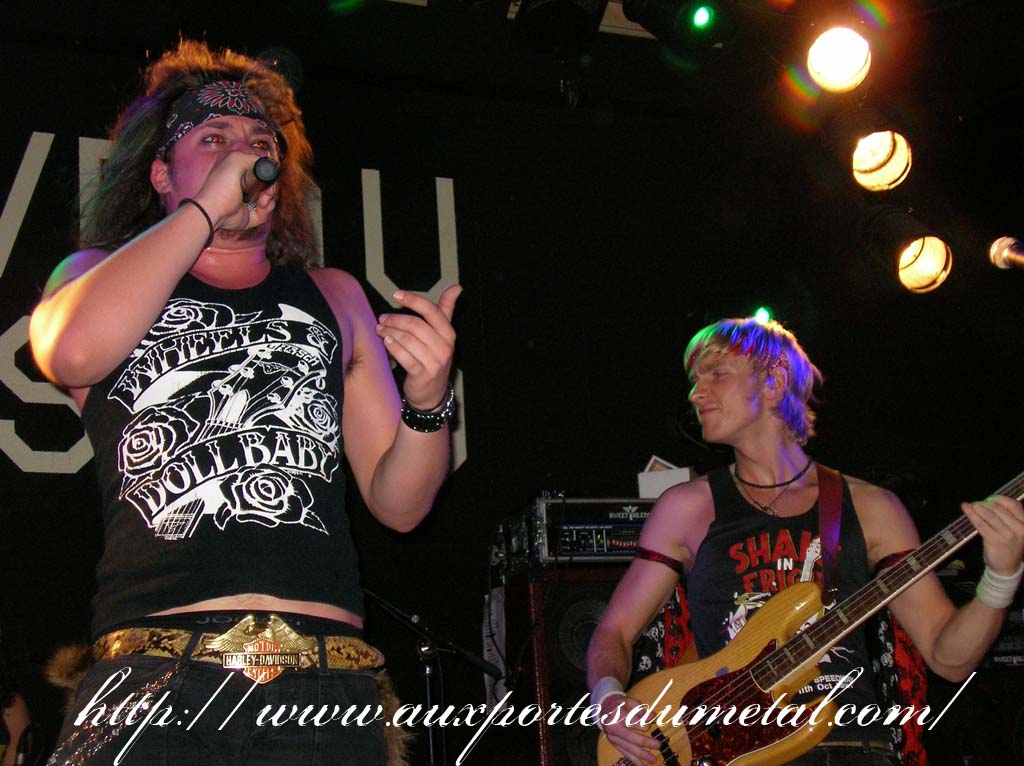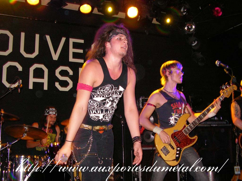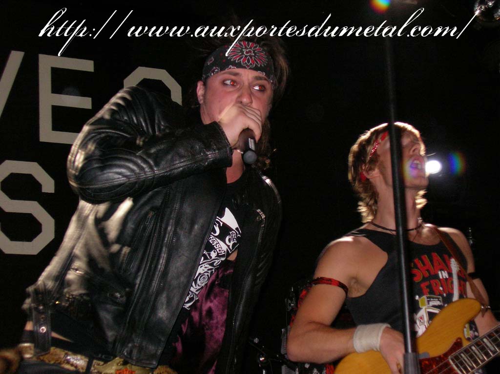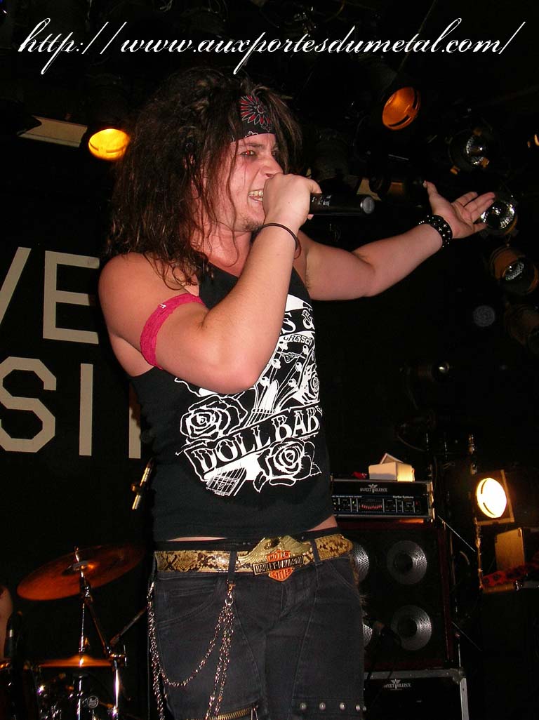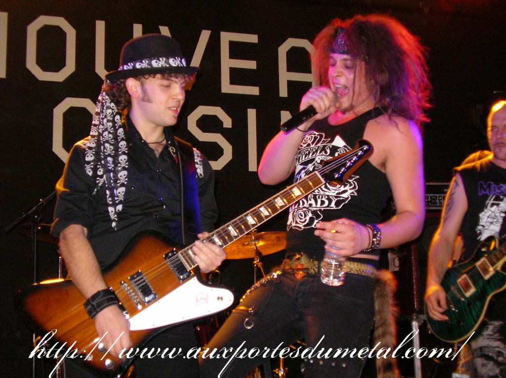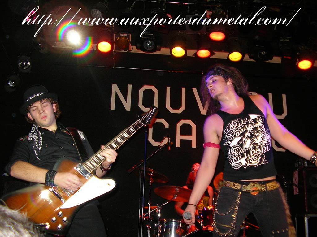 Trente, groupe de rock made in France, ouvre donc le bal avec une musique qui bien qu'elle ne soit pas mauvaise sonne quelque peu aseptisée et formatée par rapport au reste de l'affiche. Il semblerait que Trente ne doive sa présence ce soir là, qu'au fait de faire partie du même label que Koritni. Arrive ensuite Hydrogyn, qui avec son rock US aura vraiment chauffé la salle, à moins que ça ne soit la présence de la charmante Julie derrière le micro, qui ne fasse monter la salle en température. Le coffre de la chanteuse a d'ailleurs de quoi impressionner, et cela dans les deux sens du terme. Le show du groupe est lui made in US : carré, net et sans bavures. Mais il est écrit que la star du soir ne sera pas en corset rouge, car entre en scène Koritni, et comme prévu le groupe va tout simplement enflammer la salle, grâce en particulier à son frontman du même nom. Lex Koritni fidèle à lui-même avec son style 80's inimitable (ben oui une jartelle rouge autour du bras, c'est la classe quand même !) et surtout sa voix exceptionnelle qui ne faiblira pas de tout le set. Chaque morceau s'avère être un moment d'anthologie, l'entrée avec "Starving Fast" qui donne tout de suite le ton, un "Never Say Goodbye" chanté en choeur avec le public. Koritni n'a dieu merci pas oublié les titres de $ Green Dollar Colour $, en interprétant entre autre "Dirty Letter", "Heart Donation", mais surtout un "Mess with Love" dantesque où Lex Koritni empruntera un instant la guitare d'Eddy Santacreu pour interpréter une partie du solo. Mais la part belle du set est bien sur consacrée au dernier album qui sera interprété dans son quasi intégralité, ne manquant à l'appel que la reprise des Beatles. Le set se "termine" sur un "Under the Overpass" dont l'énergie, qui se dégageait de la version studio tient toutes ses promesses, une fois interprétée en live. Le groupe quitte rapidement la scène, jusqu'à ce que rugisse à nouveau la voix de Lex pour une surprise de taille. Koritni a décidé de marquer le coup pour les 20 ans de la sortie du monument des (vrais) Guns'n'Roses "Appetite for Destruction", et c'est donc le riff de "Welcome to the Jungle" qui se fait entendre dans une salle tout simplement en transe. Mais l'hommage aux Guns ne s'arrête pas là, car les titres s'enchaînent "Mr Brownstone", "Sweet Child of Mine", "Paradise City"... Le groupe quitte ensuite la scène pour de bon en laissant les spectateurs à bout de souffle et ébahie par une telle prestation. Quand on sait que Lex Koritni a préféré faire splitter $ Green Dollar Colour $ pour pouvoir chanter ses titres en live, on ne peut que le remercier pour ça. LET THERE BE KORITNI !! |